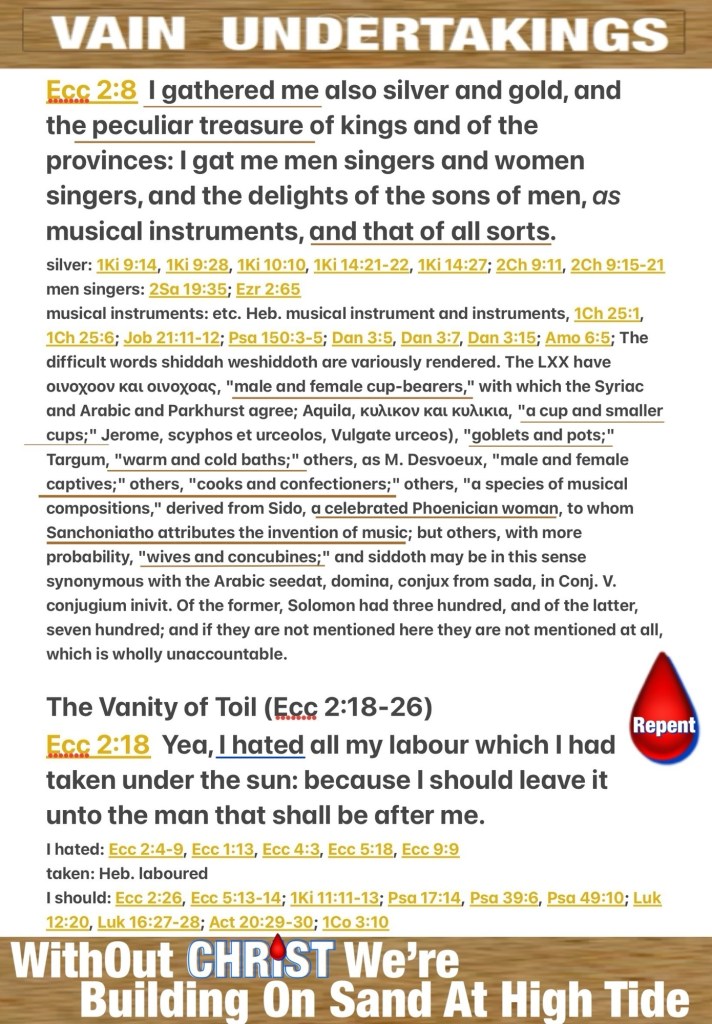 “I sought to cheer my body with wine and to embrace folly—my mind still guiding me with wisdom—until I could see what was worthwhile for men to do under heaven during the few days of their lives. and I accumulated for myself silver and gold and the treasure of kings and provinces. I gathered to myself male and female singers, and the delights of the sons of men—many concubines.” Ecclesiastes 2:3, 8 BSB