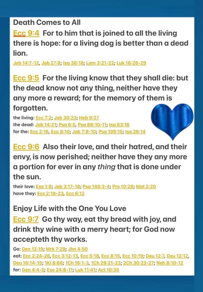 “But for him who is joined to all the living there is hope, for a living dog is better than a dead lion. For the living know that they will die; But the dead know nothing, And they have no more reward, For the memory of them is forgotten. Also their love, their hatred, and their envy have now perished; Nevermore will they have a share In anything done under the sun. Go, eat your bread with joy, And drink your wine with a merry heart; For God has already accepted your works. Whatever your hand finds to do, do it with your might; for there is no work or device or knowledge or wisdom in the grave where you are going.” Ecclesiastes 9:4-7, 10 NKJV