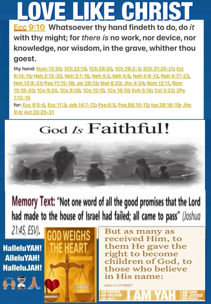 Today’s lesson Ecclesiastes 9/12 today’s verses: “But to You I have cried out, O Lord, And in the morning my prayer comes before You. Lord, why do You cast off my soul? Why do You hide Your face from me? I have been afflicted and ready to die from my youth; I suffer Your terrors; I am distraught. Your fierce wrath has gone over me; Your terrors have cut me off. They came around me all day long like water; They engulfed me altogether. Loved one and friend You have put far from me, And my acquaintances into darkness.” Psalms 88:13-18 “does not rejoice in iniquity, but rejoices in the truth;” I Corinthians 13:6 NKJV 🚶♂️❤️“For God so loved the world that He gave His only begotten Son, that whoever believes in Him should not perish but have everlasting life. For God did not send His Son into the world to condemn the world, but that the world through Him might be saved. “He who believes in Him is not condemned; but he who does not believe is condemned already, because he has not believed in the name of the only begotten Son of God. And this is the condemnation, that the light has come into the world, and men loved darkness rather than light, because their deeds were evil.” John 3:16-19 /* “[There is no exemption,] but whoever is joined with all the living, has hope; surely a live dog is better than a dead lion. For the living know that they will die; but the dead know nothing, and they no longer have a reward [here], for the memory of them is forgotten. Indeed their love, their hatred and their zeal have already perished, and they will no longer have a share [in this age] in anything that is done under the sun. Go your way, eat your bread with joy and drink your wine with a cheerful heart [if you are righteous, wise, and in the hands of God]; for God has already approved and accepted your works. Whatever your hand finds to do, do it with all your might; for there is no activity or planning or knowledge or wisdom in Sheol (the nether world, the place of the dead) where you are going.” Ecclesiastes 9:4-7, 10 AMP*/ “And Mary said: “My soul magnifies the Lord, And my spirit has rejoiced in God my Savior.” Luke 1:46-47 NKJV HOPE You LIVE With INTENTION HALLELUJAH! Live And Walk In His LOVE 🔎Spiritual War Fact: The Sad State of The living dead: The Miscarriage Of The Life Not Yet Lived 🔍 Is A Life Without Having Received The Saving Grace Of ABBA YAH ELOHIM {GOD: THE FATHER: THE SON: THE HOLY GHOST} THE BREATH OF LIFE EVERLASTING: To Be Held: Kept: Sealed: LOVED By THE MESSIAH; Is Spiritually Dead: the enemy of our soul is Preying we never see THE LIGHT and Miss out making vain this time of Probation to create his army of walking dead; GOD FORBID! You Are LOVED Beyond Measure Walk In It Be Loved 🥰 Share CHRIST
