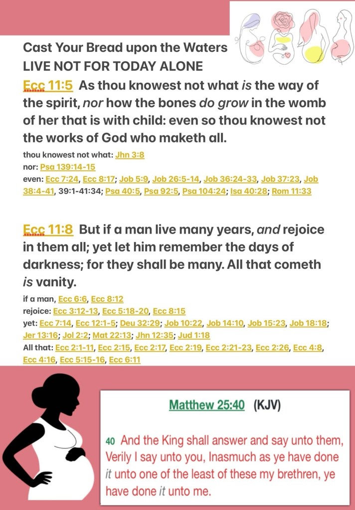 BeLoved we are only here (on earth) for a limited time; many things are and may remain a mystery especially to the carnal minded, THE WORD Gives us Revelation especially when we forsake sin and Search Him out; He Is THE GOOD NEWS That ReCreates hearts: minds: situations Depositing LOVE: LIGHT: LIFE SALVATION so Cast Your Bread Upon THE WATER He Is Big Enough To Take It And Make It Beautiful “As you do not know the path of the wind, or how the bones are formed in a mother’s womb, so you cannot understand the work of God, the Maker of all things. /* Isaiah 40:28 Hast thou not known? hast thou not heard, that the everlasting God, the LORD, the Creator of the ends of the earth, fainteth not, neither is weary? there is no searching of his understanding.*/ So if a man lives many years, let him rejoice in them all. /* “Rejoice in the Lord always [delight, take pleasure in Him]; again I will say, rejoice! [Ps 37:4]” Philippians 4:4 AMP */ But let him remember the days of darkness, for they will be many. Everything to come is futile. Rejoice, O young man, while you are young, and let your heart be glad in the days of your youth. Walk in the ways of your heart and in the sight of your eyes, but know that for all these things God will bring you to judgment. /* Job 10:22 A land of darkness, as darkness itself; and of the shadow of death, without any order, and where the light is as darkness. Galatians 6:8-10 For he that soweth to his flesh shall of the flesh reap corruption; but he that soweth to the Spirit shall of the Spirit reap life everlasting. And let us not be weary in well doing: for in due season we shall reap, if we faint not. As we have therefore opportunity, let us do good unto all men, especially unto them who are of the household of faith.*/ So banish sorrow from your heart, and cast off pain from your body, for youth and vigor are fleeting.” Ecclesiastes 11:5, 8-10 BSB /* ““Glory to God in the highest [heaven], And on earth peace among men with whom He is well-pleased.”” Luke 2:14*/. John 3:8 ❤️The wind bloweth where it listeth, and thou hearest the sound thereof, but canst not tell whence it cometh, and whither it goeth: so is every one that is born of the Spirit. Cast Your Bread Upon THE WATER