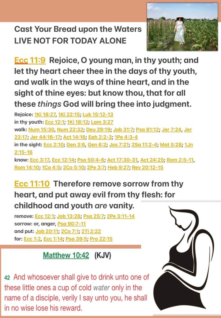 “As you do not know what is the way of the wind, Or how the bones grow in the womb of her who is with child, So you do not know the works of God who makes everything. But if a man lives many years And rejoices in them all, Yet let him remember the days of darkness, For they will be many. All that is coming is vanity. Rejoice, O young man, in your youth, And let your heart cheer you in the days of your youth; Walk in the ways of your heart, And in the sight of your eyes; But know that for all these God will bring you into judgment. Therefore remove sorrow from your heart, And put away evil from your flesh, For childhood and youth are vanity.” Ecclesiastes 11:5, 8-10 NKJV