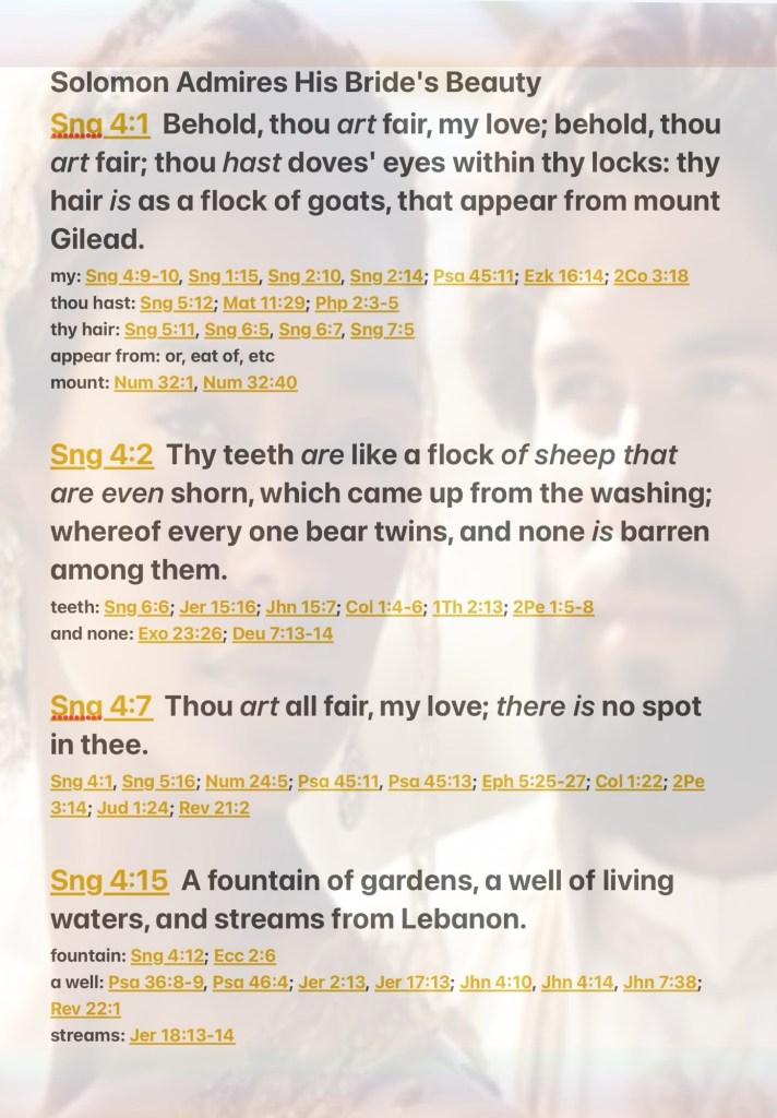 Today’s lesson Song of Soloman 4/8, today’s verses: “The work of righteousness will be peace, And the effect of righteousness, quietness and assurance forever. My people will dwell in a peaceful habitation, In secure dwellings, and in quiet resting places,” Isaiah 32:17-18 “But when Jesus saw it, He was greatly displeased and said to them,❤️ “Let the little children come to Me, and do not forbid them; for of such is the kingdom of God.” Mark 10:14 NKJV 🚶♂️ “But at midnight Paul and Silas were praying and singing hymns to God, and the prisoners were listening to them.” Acts 16:25 “But this I say: He who sows sparingly will also reap sparingly, and he who sows bountifully will also reap bountifully.” II Corinthians 9:6 NKJV LOVES MIRACLE we’ve been created to Share In And Know LOVE 💗 ““How fair and beautiful you are, my darling, How very beautiful! Your eyes behind your veil are like those of a dove; Your hair is like [the shimmering black fleece of] a flock of [Arabian] goats That have descended from Mount Gilead [beyond the Jordan]. “Your teeth are like a flock of newly shorn ewes Which have come up from washing, All of which bear twins, And not one among them has lost her young. ¶“O my love, you are altogether beautiful and fair. There is no flaw nor blemish in you! [John 14:18; Eph 5:27] “You are a fountain in a garden, A well of fresh and living water, And streams flowing from Lebanon.” [John 4:10; 7:37, 38]” Song of Solomon 4:1-2, 7, 15 AMP HalleluYAH!