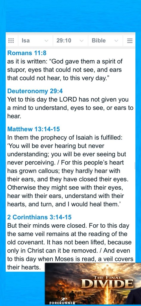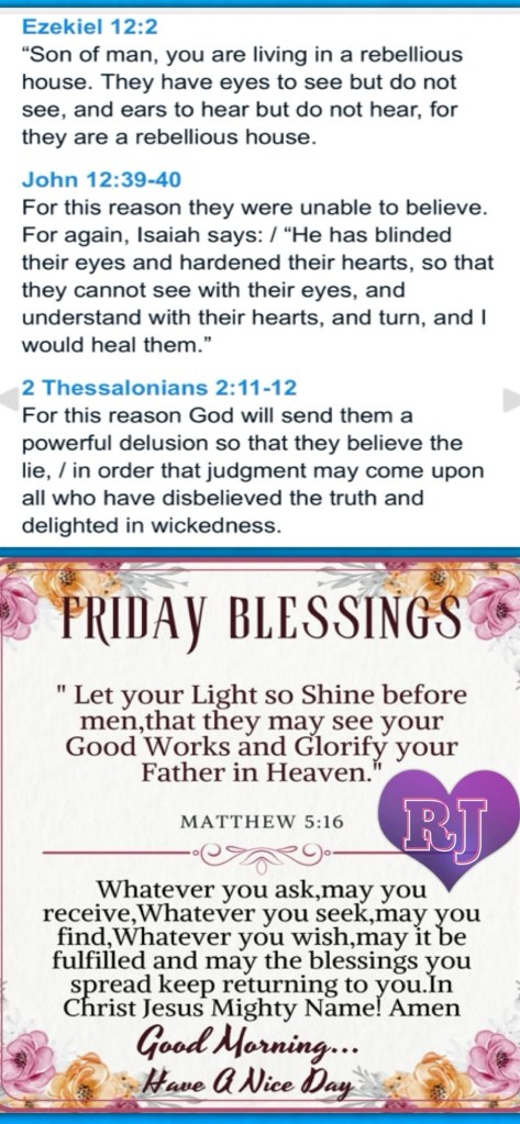 Happy Preparation Day BeLoved child of THE MOST HIGH GOD יהוה YAHUAH ELOHIM: THE CREATOR: AUTHOR ✍🏽 AUTHORITY: OMNIPOTENT OMNISCIENT OMNIPRESENT: THE RUACH HA’QUODESH BREATH OF LIFE: MESSIAH יהושע YAHUSHA JESUS CHRIST: THE WORD: THE LAW JUDGE TRUTH ETERNAL SACRIFICE REFINER SOVEREIGN LORD OF HOSTS THE HOLY SET APART SPIRIT THE GREAT I AM REFUGE COVER PROTECTIVE HEDGE 🩸AGAPÉ LOVE EMBODIED. Spiritual Blindness-Lethargy- Sleep-Death Is A Progressive Decline Towards Complete Annihilation And Separation From our SOVEREIGN LORD ABBA YAH It is the state of being that follows the repeated unrepentant rebellion and rejection of THE GIFT OF SALVATION PROVIDED BY CHRIST THAT IS CHRIST This Is The Greatest Crisis effecting man “Ariel Is As Good As Dead!” The Only Thing Worse Than Death Is To Live and Then Die UnSAVED or Live Disconnected From THE SOURCE OF LIFE יהושע JESUS CHRIST This Is The Set Up To Receive GOD’S WRATH The Strange Work Necessary To Finally Eradicate Sin In All Its Forms. “Woe (judgment is coming) to Ariel, to Ariel, the city where David [once] camped! Add yet another year; let the feasts run their course [but only one year more]. I will camp against you and encircle you, And I will hem you in with siege works, And I will raise fortifications against you. For the Lord has poured over you a spirit of deep sleep. He has closed your eyes, [you who are] the prophets; And He has covered your heads, [you who are] the seers. Then the Lord said, “Because this nation approaches [Me only] with their words And honors Me [only] with their lip service, But they remove their hearts far from Me, And their reverence for Me is a tradition that is learned by rote [without any regard for its meaning],” Isaiah 29:1, 3, 10, 13 AMP Woe Ariel Is As Good As Dead⚠️ Don’t seem surprised we can’t hoodwink GOD; YAH Accepts Returns ⏳