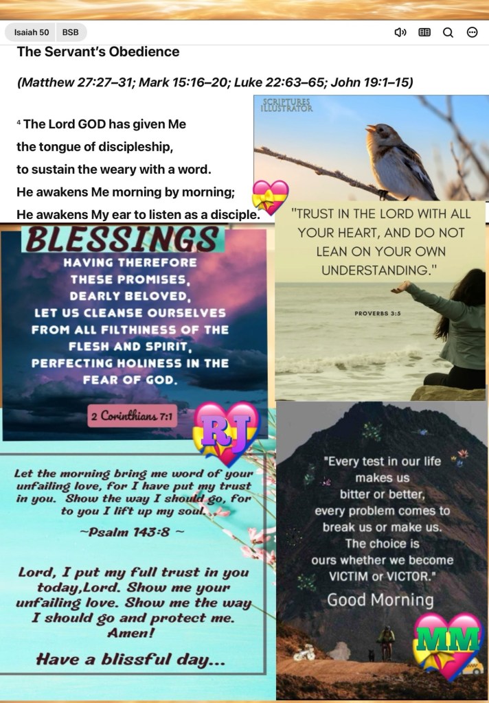 Today’s lesson Isaiah 50/66, today’s verses: “Mary Magdalene came and told the disciples that she had seen the Lord, and that He had spoken these things to her.” John 20:18 ❤️ “Therefore you also be ready, for the Son of Man is coming at an hour you do not expect.”” Luke 12:40 NKJV 🚶♂️“Praise ye the LORD. Praise God in his sanctuary: Praise him in the firmament of his power. Praise him for his mighty acts: Praise him according to his excellent greatness. Praise him with the sound of the trumpet: Praise him with the psaltery and harp. Praise him with the timbrel and dance: Praise him with stringed instruments and organs. Praise him upon the loud cymbals: Praise him upon the high sounding cymbals. Let every thing that hath breath Praise the LORD. Praise ye the LORD.” Psalm 150:1-6 KJV “But I do not consider my life as something of value or dear to me, so that I may [with joy] finish my course and the ministry which I received from the Lord Jesus, to testify faithfully of the good news of God’s [precious, undeserved] grace [which makes us free of the guilt of sin and grants us eternal life].” Acts 20:24 AMP 🛡️The Holy Sabbath Is A Commemorative Celebration and begins at sunset Get Ready (x3) Be LOVED 🚸 Walk GOOD
