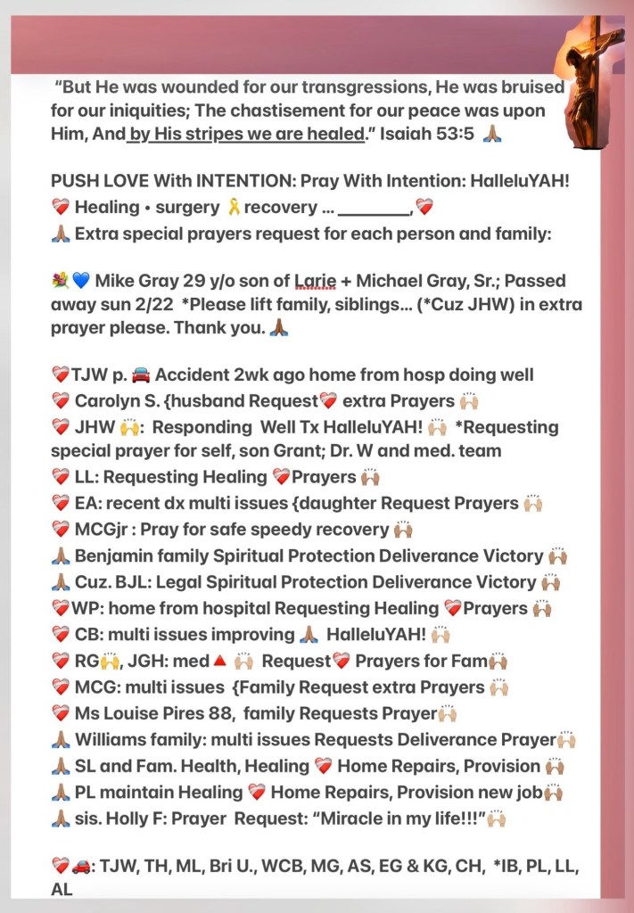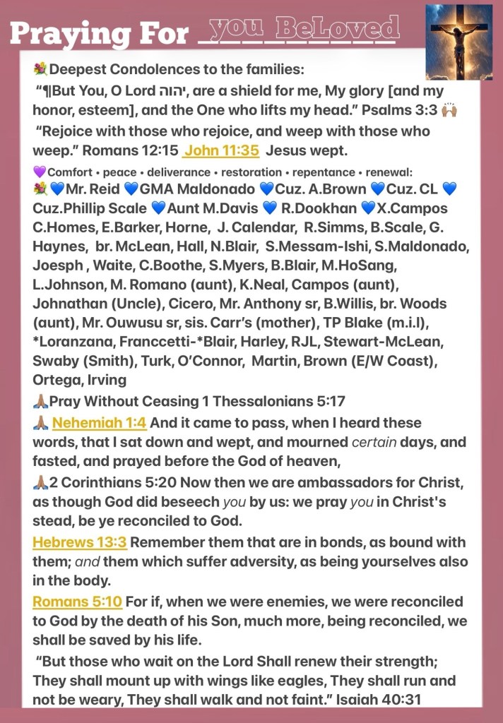 Greetings BeLoved child of THE MOST HIGH GOD יהוה YAHUAH ELOHIM: THE CREATOR: AUTHOR ✍🏽 AUTHORITY: THE COMMANDER MESSIAH יהושע YAHUSHA JESUS CHRIST: THE WORD: THE LAW JUDGE JUSTICE TRUTH ETERNAL SACRIFICE SANCTIFIER REFINER ANOINTED REDEEMER SALVATION WARRIOR THE RUACH HA’QUODESH BREATH OF LIFE THE HOLY SET APART SPIRIT: ALPHA OMEGA THE WAY AGAPÈ LOVING KINDNESS GOODNESS LOVE: COMPASSION STRENGTH PEACE HEALING FAVOR BLESSINGS RIGHTEOUSNESS RENEWAL DELIVERANCE THE HUSBANDMAN LORD OF HOSTS ABBA YAH COMFORTER COVER THE FRONT AND REAR GUARD Yes we are in a Spiritual War But THE LORD your GOD IS In your Midst, THE WARRIOR Who IS יהושע SALVATION: “¶Be still before the Lord; wait patiently for Him and entrust yourself to Him; Do not fret (whine, agonize) because of him who prospers in his way, Because of the man who carries out wicked schemes.” Psalms 37:7 AMP ““Be still and know (recognize, understand) that I am God. I will be exalted among the nations! I will be exalted in the earth.”” Psalms 46:10 AMP You Have The Right To Remain Silent Use It To PRAY: “Turn to me and be gracious, for I am lonely and afflicted.” Psalms 25:16 “When all has been heard, the conclusion of the matter is this: Fear God and keep His commandments, because this is the whole duty of man.” Ecclesiastes 12:13 BSB “¶But [in fact] He has borne our griefs, And He has carried our sorrows and pains; Yet we [ignorantly] assumed that He was stricken, Struck down by God and degraded and humiliated [by Him]. [Matt 8:17] But He was wounded for our transgressions, He was crushed for our wickedness [our sin, our injustice, our wrongdoing]; The punishment [required] for our well-being fell on Him, And by His stripes (wounds) we are healed. All of us like sheep have gone astray, We have turned, each one, to his own way; But the Lord has caused the wickedness of us all [our sin, our injustice, our wrongdoing] To fall on Him [instead of us]. [1 Pet 2:24, 25] ¶He was oppressed and He was afflicted, Yet He did not open His mouth [to complain or defend Himself]; Like a lamb that is led to the slaughter, And like a sheep that is silent before her shearers, So He did not open His mouth. Therefore, I will divide and give Him a portion with the great [kings and rulers], And He shall divide the spoils with the mighty, Because He [willingly] poured out His life to death, And was counted among the transgressors; Yet He Himself bore and took away the sin of many, And interceded [with the Father] for the transgressors. [Luke 22:37]” Isaiah 53:4-7, 12 AMP For all who are suffering loss (of life of a loved one, health etc) please bring your hearts concerns to THE ALMIGHTY He Is COMFORT PEACE LOVE (Y)JEHOVAH (Y) JIRÈH Able To Meet And Exceed our Every Need, we are nearing the end of human probation and we will experience loss No Knows This More Than ABBA YAH Who Allowed JESUS CHRIST To Be: “And He [that same Jesus] is the propitiation for our sins [the atoning sacrifice that holds back the wrath of God that would otherwise be directed at us because of our sinful nature—our worldliness, our lifestyle]; and not for ours alone, but also for [the sins of all believers throughout] the whole world.” 1 John 2:2 AMP And Suffer Ultimate Loss To Save us What an Incredible Gift. Whatever the situation Hold On To CHRIST “¶Tremble [with anger or fear], and do not sin; Meditate in your heart upon your bed and be still [reflect on your sin and repent of your rebellion]. [Eph 4:26] Selah.” Psalms 4:4 AMP ““Be still before the Lord, all mankind; for He is roused (raised up) from His holy habitation [in response to His persecuted people].” [Hab 2:20; Zeph 1:7]” Zechariah 2:13 AMP
