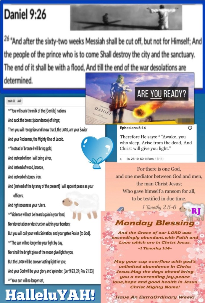 Today’s lesson Isaiah 60/66, today’s verses: “This is a faithful and trustworthy saying: if any man [eagerly] seeks the office of overseer (bishop, superintendent), he desires an excellent task.” 1 Timothy 3:1 “Therefore there is now no condemnation [no guilty verdict, no punishment] for those who are in Christ Jesus [who believe in Him as personal Lord and Savior]. [John 3:18]” Romans 8:1 AMP 🚶♂️“But the Law came to increase and expand [the awareness of] the trespass [by defining and unmasking sin]. But where sin increased, [God’s remarkable, gracious gift of] grace [His unmerited favor] has surpassed it and increased all the more, so that, as sin reigned in death, so also grace would reign through righteousness which brings eternal life through Jesus Christ our Lord.” Romans 5:20-21 “Do not be overcome and conquered by evil, but overcome evil with good.” Romans 12:21 AMP Again “But for you who fear My name {* יהוה YAH ELOHIM*}[with awe-filled reverence] the sun of righteousness will rise with healing in its wings. And you will go forward and leap [joyfully] like calves [released] from the stall.” Malachi 4:2 AMP “¶“Foreigners will build up your walls, And their kings will serve you; For in My [righteous] wrath I struck you, But in My favor and grace I have had compassion on you. “You will suck the milk of the [Gentile] nations And suck the breast (abundance) of kings; Then you will recognize and know that I, the Lord, am your Savior And your Redeemer, the Mighty One of Jacob. “Instead of bronze I will bring gold, And instead of iron I will bring silver, And instead of wood, bronze, And instead of stones, iron. And [instead of the tyranny of the present] I will appoint peace as your officers, And righteousness your rulers. “Violence will not be heard again in your land, Nor devastation or destruction within your borders; But you will call your walls Salvation, and your gates Praise [to God]. “The sun will no longer be your light by day, Nor shall the bright glow of the moon give light to you, But the Lord will be an everlasting light for you; And your God will be your glory and splendor. [Jer 9:23, 24; Rev 21:23] “Your sun will no longer set, Nor will your moon wane; For the Lord will be your everlasting light, And the days of your mourning will be over.” Isaiah 60:10, 16-20 AMP PUSH FORWARD TO VICTORY HALLELUJAH! Pray Until Salvation Happens Stay Rooted In CHRIST