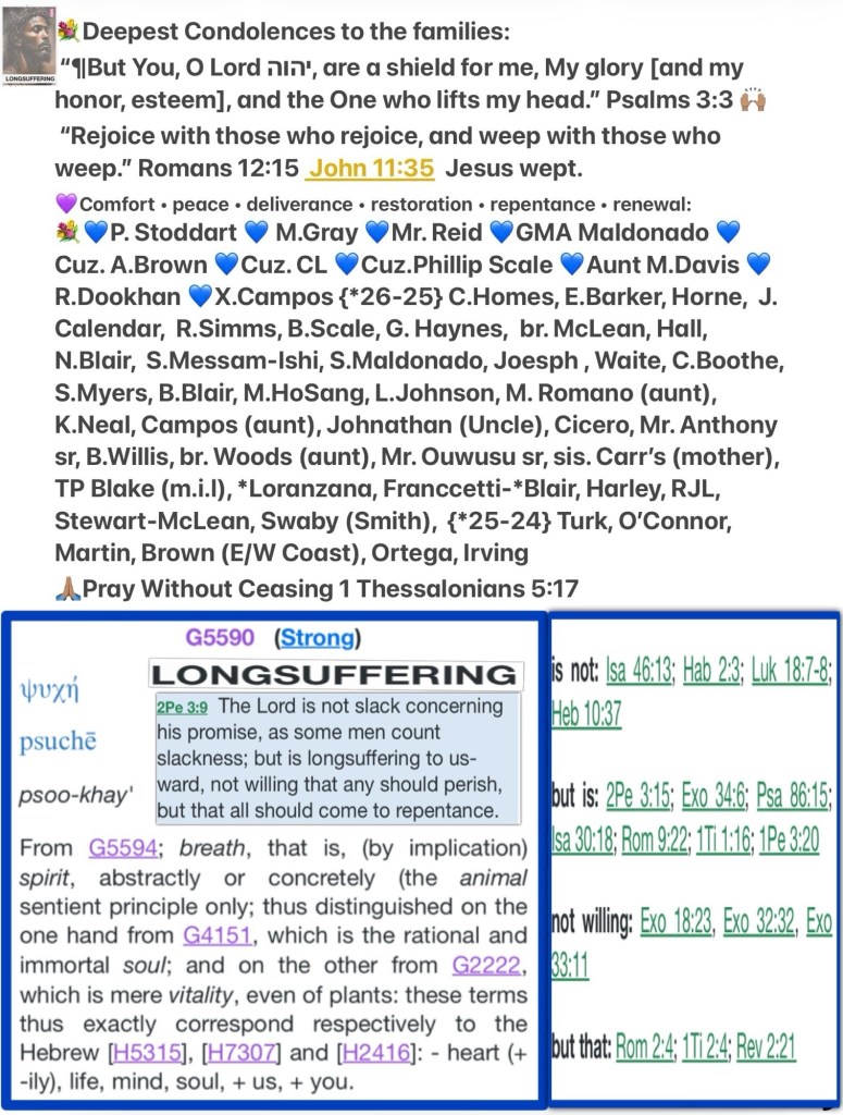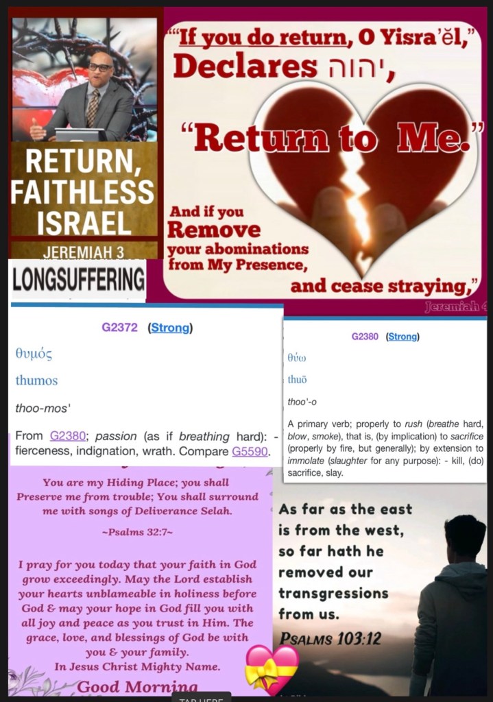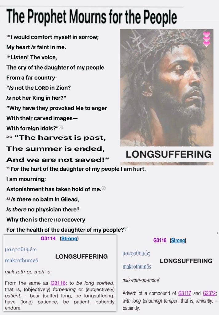 Today’s lesson Jeremiah 8/52, today’s verses: “Jesus said unto him, ❤️Verily I say unto thee, That this night, before the cock crow, thou shalt deny me thrice. Peter said unto him, Though I should die with thee, yet will I not deny thee. Likewise also said all the disciples.” Matthew 26:34-35 KJV “Therefore we also, since we are surrounded by so great a cloud of witnesses, let us lay aside every weight, and the sin which so easily ensnares us, and let us run with endurance the race that is set before us,” Hebrews 12:1 NKJV 🚶♂️ “In Him we have redemption [that is, our deliverance and salvation] through His blood, [which paid the penalty for our sin and resulted in] the forgiveness and complete pardon of our sin, in accordance with the riches of His grace” Ephesians 1:7 AMP “Give thanks to יהוה! Call upon His Name, Make known His deeds among the peoples.” Tehillim (Psalms) 105:1 {https://bible.com/bible/316/psa.105.1.TS2009 Don’t Take YHWH’S LOVING KINDNESS For Weakness GOD IS LOVE Doesn’t Mean He’s Soft: Take A Good Look At Our LONG SUFFERING SAVIOR Every thing you see or experience He’s Created and Will ReCreate at The Right Time “They will [carelessly scatter and] spread them out before the sun and the moon and all the host of heaven, which the dead have loved and which they have served, and which they have walked after and which they have sought, and which they have worshiped. They will not be gathered or be buried; they will be like dung on the face of the earth. And death will be chosen rather than life by all the remnant of those who remain of this evil family (nation), who remain in all the places to which I have driven them,” says the Lord of hosts. ¶“How can you say, ‘We are wise, And the law of the Lord is with us [and we are learned in its language and teachings]’? Behold, [the truth is that] the lying pen of the scribes Has made the law into a lie [a mere code of ceremonial observances]. [Mark 7:13] “Therefore I will give their wives to others And their fields to new owners; Because from the least even to the greatest Everyone is greedy for [unjust] gain; From the prophet even to the priest Everyone practices deceit and deals in corruption. ¶“I will gather and snatch them away [utterly consuming them],” says the Lord. “There will be no grapes on the vine, Nor figs on the fig tree, And even the leaf will wither; And the things that I have given them will pass away [by the hand of those whom I have appointed].” ’ ” [Matt 21:18, 19] “For behold, I am sending serpents among you, Vipers which cannot be charmed, And they will bite you,” says the Lord. Behold, [hear the sound of] the cry of the daughter of my people from the distant land [of Babylon]: “Is not the Lord in Zion? Is not her King within her?” [But the Lord answers] “Why have they provoked Me to anger with their carved images and with foreign idols?” “The harvest is past, the summer has ended and the gathering of fruit is over, But we are not saved,” [comes the voice of the people again]. For the brokenness of the daughter of my people I (Jeremiah) am broken; I mourn, anxiety has gripped me.” Jeremiah 8:2-3, 8, 10, 13, 17, 19-21 AMP GOD IS LOVE Doesn’t Mean He’s Soft: Take A Look At Our LONG SUFFERING SAVIOR “I will not execute the full fury of My anger; I will not destroy Ephraim again. For I am God and not man — the Holy One among you — and I will not come in wrath.”Hosea 11:9 BSB 🩸Il Peter 3:9: (a) The Lord is not slack concerning His promise, as some count slackness, but (b)’ is longsuffering toward us, (c) not willing that any should perish but (d) that all should come to repentance. 🙌🏽 (a) Hab. 2:3; Rom. 13:11; Heb. 10:37 (b) Ps. 86:15; Is. 30:18 (c) Ezek. 33:11 (d) Matt. 20:28; (Rom. 2:4) “Jesus said to him,❤️ “I assure you and most solemnly say to you, this night, before a rooster crows, you will [completely] deny Me three times.” Peter said to Jesus, “Even if I have to die with You, I will not deny You!” And all the disciples said the same thing.” Matthew 26:34-35 “Therefore, since we are surrounded by so great a cloud of witnesses [who by faith have testified to the truth of God’s absolute faithfulness], stripping off every unnecessary weight and the sin which so easily and cleverly entangles us, let us run with endurance and active persistence the race that is set before us,” Hebrews 12:1 AMP 🚶♂️“In Him we have redemption [that is, our deliverance and salvation] through His blood, [which paid the penalty for our sin and resulted in] the forgiveness and complete pardon of our sin, in accordance with the riches of His grace” Ephesians 1:7 AMP “O give thanks to the Lord, call upon His name; Make known His deeds among the people.” Psalms 105:1 AMP Our FATHER Is Heartbroken 💔 but Don’t count Him Out He’s Still Fighting To Win your heart and mine, Repent let’s Not Disappoint