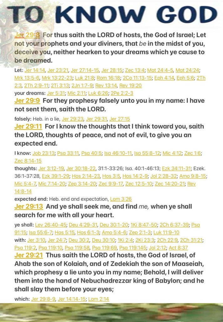 “For thus says the Lord of hosts, the God of Israel: Do not let your prophets and your diviners who are in your midst deceive you, nor listen to your dreams which you cause to be dreamed. For they prophesy falsely to you in My name; I have not sent them, says the Lord. For I know the thoughts that I think toward you, says the Lord, thoughts of peace and not of evil, to give you a future and a hope. And you will seek Me and find Me, when you search for Me with all your heart. Thus says the Lord of hosts, the God of Israel, concerning Ahab the son of Kolaiah, and Zedekiah the son of Maaseiah, who prophesy a lie to you in My name: Behold, I will deliver them into the hand of Nebuchadnezzar king of Babylon, and he shall slay them before your eyes.”Jeremiah 29:8-9, 11, 13, 21 NKJV