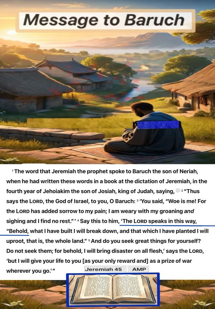 ““This is what the Lord, the God of Israel, says to you, Baruch: You have said, ‘Woe is me because the Lord has added sorrow to my pain! I am worn out with groaning and have found no rest.’” But as for you, do you seek great things for yourself? Stop seeking! For I will bring disaster on every living creature, declares the Lord, but wherever you go, I will grant your life as a spoil of war.”” Jeremiah 45:2-3, 5 BSB