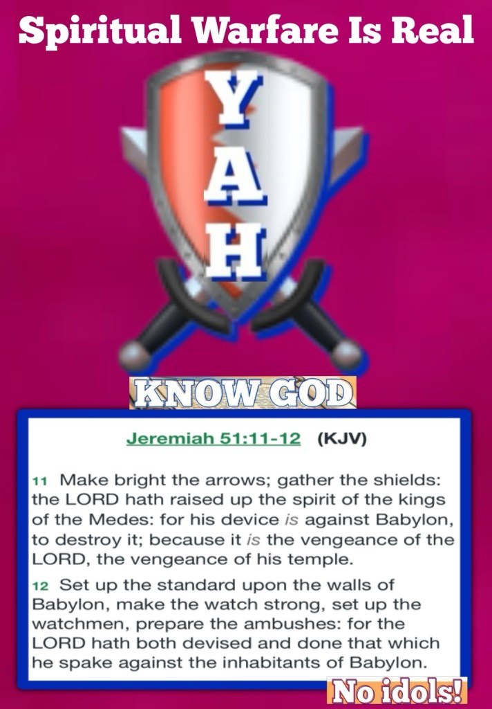 BeLoved It Is True we’re living through an actual Spiritual War; every day won’t be rosy but ABBA יהוה YAHUAH ELOHIM THE SOVEREIGN KING THE CREATOR: THE LORD Of Hosts: THE COMMANDER Has Spoken; Shema: Listen And Obey Him! Obey THE VOICE OF יהוה GOD THE TRUE FAITHFUL WITNESS: יהושע THE WORD Be ASSURED the Queen of Heaven Is A Fallacy: Deception Idolatry; from such Stay Away! You Are BLESSED To Be A BLESSING! Probation is soon closing our choices will soon be permanent and then The Judgement | “And יהוה shall be Sovereign {King} over all the earth. In that day there shall be one {worshiped} יהוה, and His Name one.” Zeḵaryah (Zechariah) 14:9 TS2009 | May THE LORD יהוה Be With You! Bible Study Gets our minds Right and Builds our Relationship with our Heavenly FATHER GOD As THE HOLY SPIRIT Gets us Ready Shema Be LOVED: ““Line up the buckler (small shield) and [large] shield, And advance for battle! For that day belongs to the Lord God of hosts, A day of vengeance, that He may avenge Himself on His adversaries. And the sword will devour and be satiated And drink its fill of their blood; For the Lord God of hosts has a sacrifice [like that of a great sin offering] In the north country by the river Euphrates. “As I live,” says the King, Whose name is the Lord of hosts, “Surely like Tabor among the mountains Or like Carmel by the sea, So shall he [the great king of Babylon] come. The Lord of hosts, the God of Israel, says, “Behold, I am going to punish Amon [chief god of the sacred city] of Thebes [the capital of Upper Egypt], and Pharaoh, and Egypt along with her gods and her kings—even Pharaoh and those who put their trust in him [as a shield against Babylon]. “Do not fear, O Jacob My servant,” says the Lord, “For I am with you. For I will make a full and complete end of all the nations To which I have driven you; Yet I will not make a full end of you. But I will discipline and correct you appropriately And by no means will I declare you guiltless or leave you unpunished.”” Jeremiah 46:3, 10, 18, 25, 28 AMP The counterfeiting has gone on for too long… when sin Gets Judged {*The Lord of Hosts, the God of Israel, says: “Behold, I am about to punish Amon god of Thebes, along with Pharaoh, Egypt with her gods and kings, and those who trust in Pharaoh. And you, My servant Jacob, do not be afraid, declares the Lord, for I am with you.*BSB} we can’t Be found in possession if you know what I mean. Break up with sin: Let Go of the small “g” problems: beliefs: mindsets: conditions And Let THE LORD יהוה Be With You!