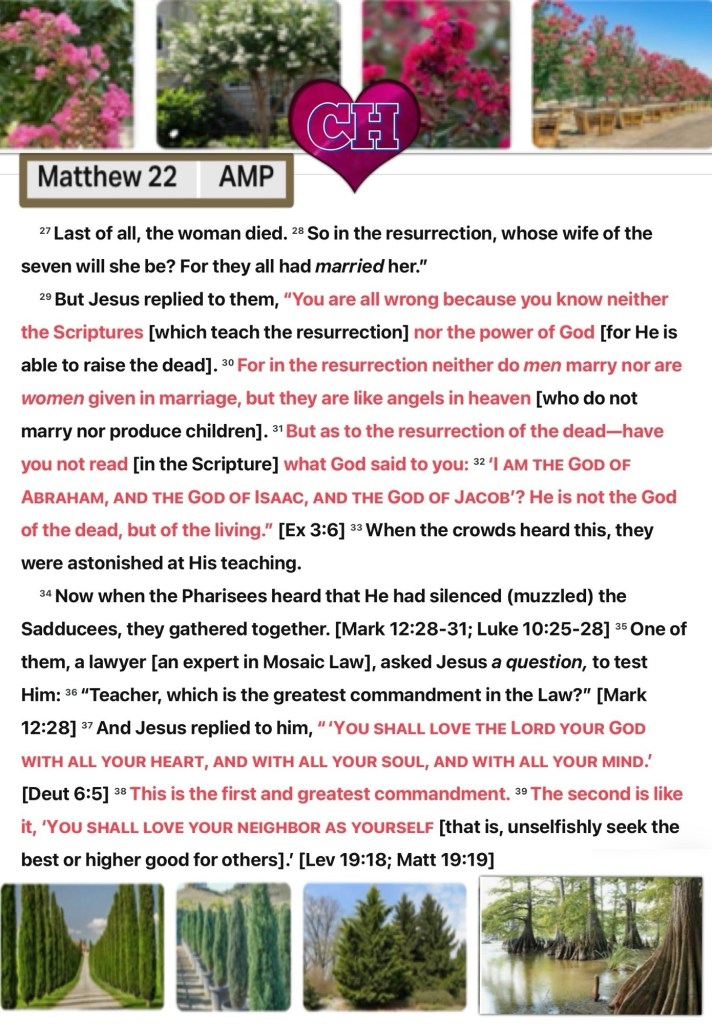 Today’s lesson Jeremiah 47/52, today’s verses: ““Instead of the thorn bush the cypress tree will grow, And instead of the nettle the myrtle tree will grow; And it will be a memorial to the Lord, For an everlasting sign [of His mercy] which will not be cut off.”” Isaiah 55:13 “Little children (believers, dear ones), you are of God and you belong to Him and have [already] overcome them [the agents of the antichrist]; because He who is in you is greater than he (Satan) who is in the world [of sinful mankind].” 1 John 4:4 AMP 🚶♂️ “Now these people were more noble and open-minded than those in Thessalonica, so they received the message [of salvation through faith in the Christ] with great eagerness, examining the Scriptures daily to see if these things were so.” Acts 17:11 “But all these things are from God, who reconciled us to Himself through Christ [making us acceptable to Him] and gave us the ministry of reconciliation [so that by our example we might bring others to Him],” 2 Corinthians 5:18 AMP ❤️ “If you keep My commandments and obey My teaching, you will remain in My love, just as I have kept My Father’s commandments and remain in His love.” John 15:10 {https://bible.com/bible/1588/jhn.15.10.AMP